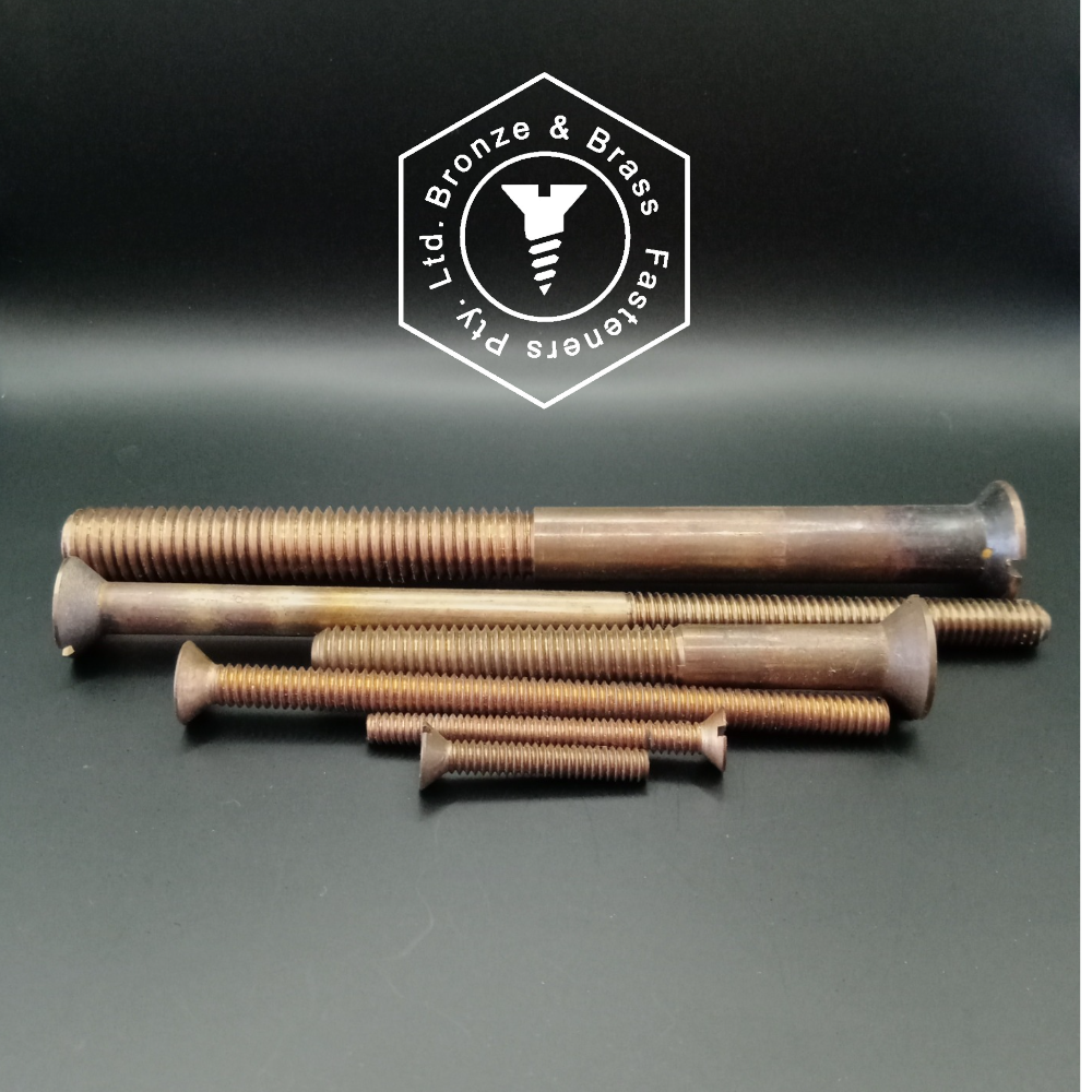 A countersunk metal thread machine screw with a traditional slot drive, that can either fastened with a nut and washer or into a female thread or component. With a flat
